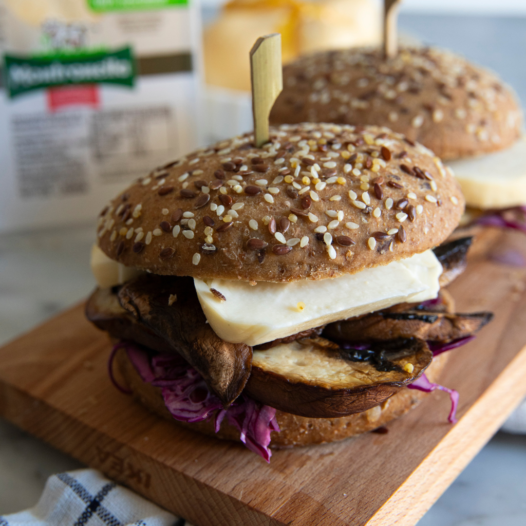 Bun burger con funghi insalata di cavolo viola e quadrifoglio affumicato